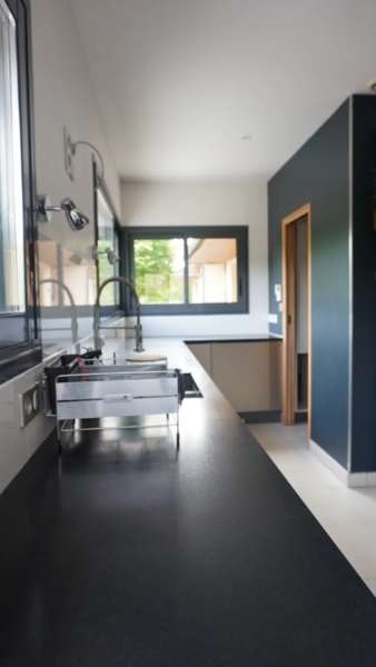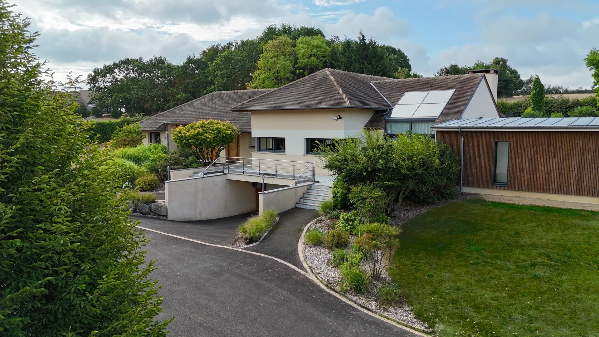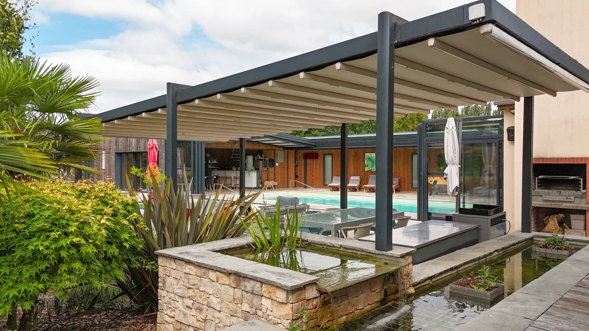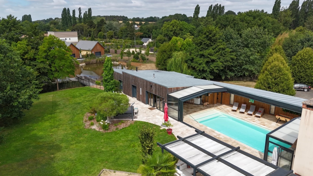 72. SOLESMES. OASIS DE LUXE. En plein coeur de Solesmes dans la Sarthe, à 2 pas de la fameuse Abbaye de Saint Pierre, s’offre à vous un havre de paix d’un raffinement exquis avec des prestations haut de gamme où le bien-être est érigé en art de vivre. Ce bien, unique dans la région, se situe dans la partie la plus prisée de la route de Beaucé et vous permet de bénéficier de deux espaces de vie indépendants, avec accès séparés pour chacun, sur un terrain boisé de plus de 1,5ha avec au milieu un grand étang naturel et très poissonneux. La première villa vous permet de vivre dans une maison de 300m² habitables avec ses réceptions, cuisine, 6 chambres et leurs pièces d’eau, terrasses et accés direct à la partie pool house de plus de 210m² avec sa grande piscine à toit transparent et escamotable, sauna, hammam, salle de sport, babby foot, bar, lieu de convivialité et détente, terrain de pétanque. En enjambant un petit pont on accède à la deuxième partie du domaine, construit récemment, qui est contitué d’une grande réception avec salon, salle à manger, cuisine ouverte et 4 suites état d’esprit lodges de plus de 40m² chacune, avec leurs salles d’eau et terrasses et jaccuzzi, donnant la sensation d’être chacun chez soi tout en partageant les instants de convivialité.