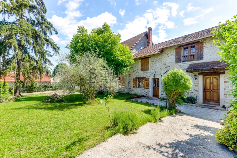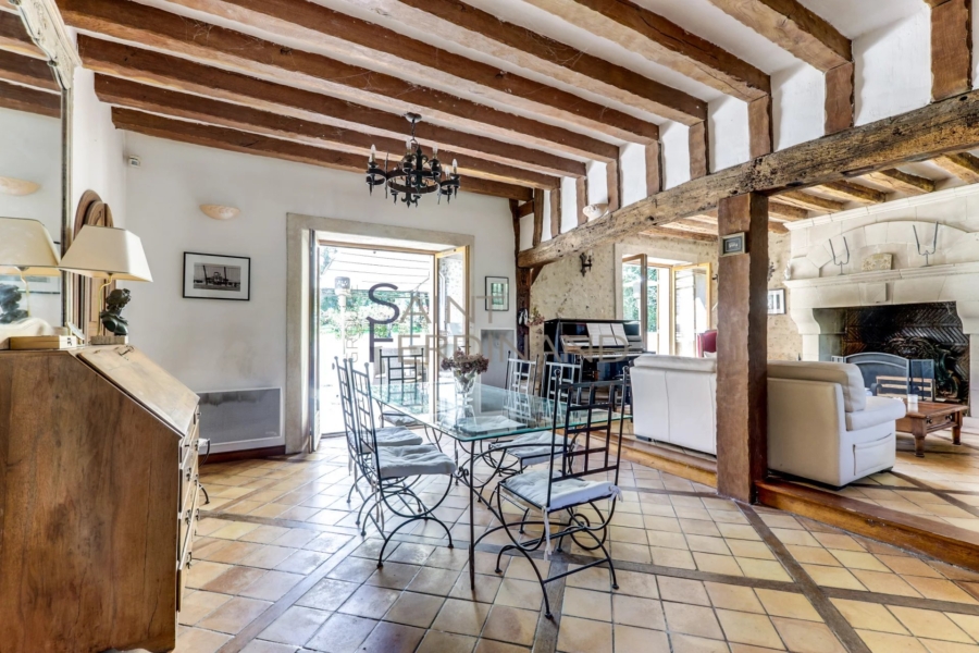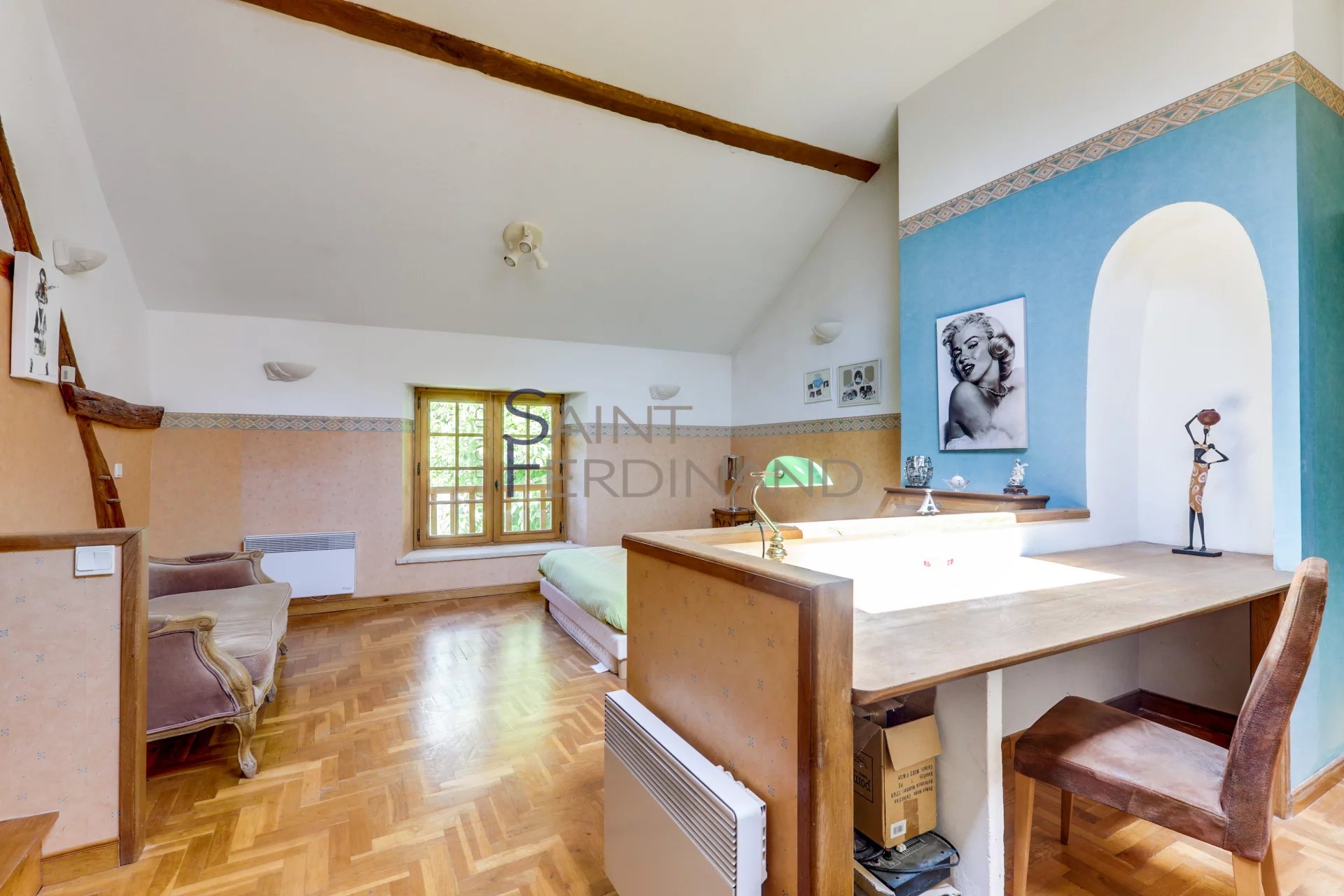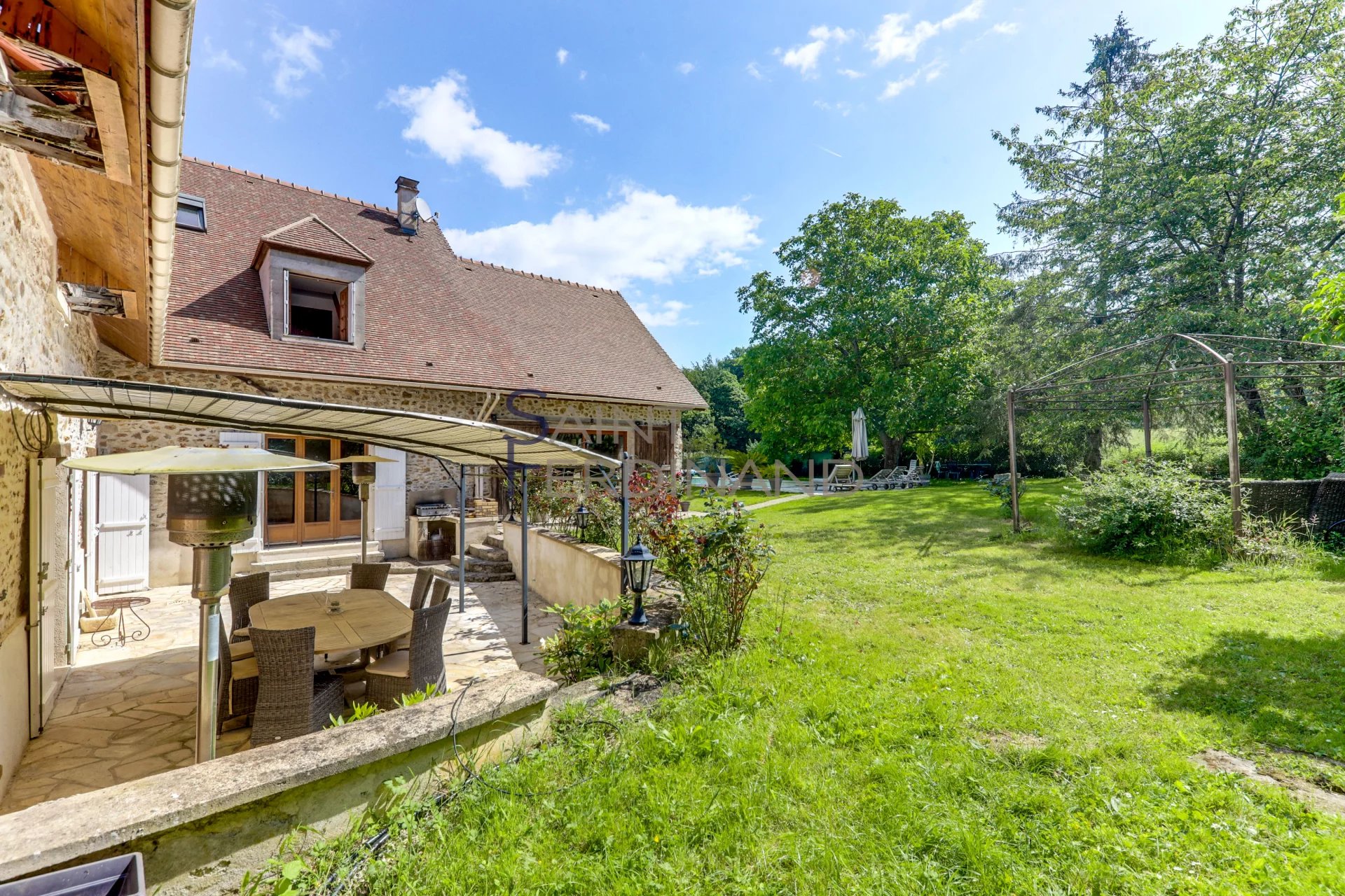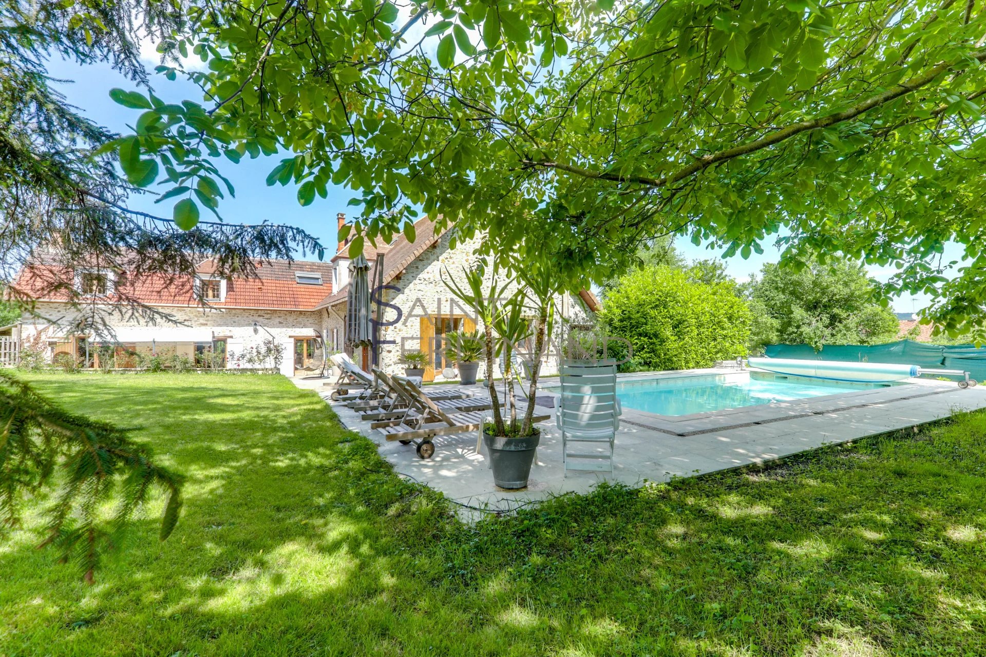 91. Maison de 10 pièces. St CYR s/s Dourdan 91. Saint-Cyr-sous-Dourdan à 7mns de DOURDAN. Jolie maison ancienne en Pierre de 395m² habitables (280m2 carrez), édifiée sur un terrain de 1785m² avec sa piscine. Elle se compose au rez-de-chaussée: d’un grand salon et salle à manger avec cheminée et poutres apparentes donnant sur une grande terrasse, cuisine dinatoire, buanderie, salon TV et billard, bureau, cabinet de toilette. A l’étage: six chambres, salle de bains, deux WC, salle d’eau, dressing, deux greniers, Mezzanine. Atelier, garage, cave à vins, Piscine chauffée. ensoleillé. Caractère. Pour les amoureux du calme et la verdure cette maison est un havre paix.