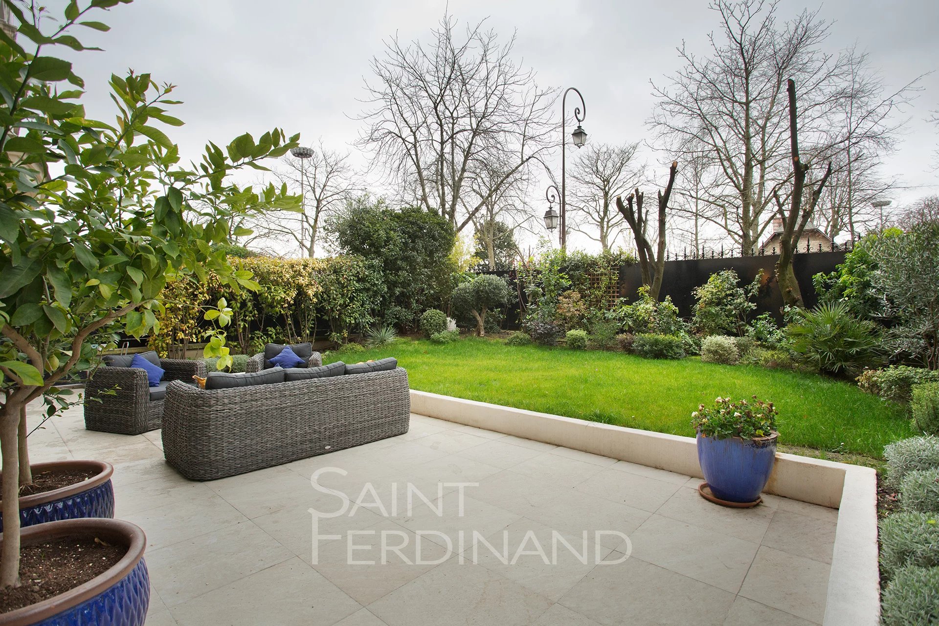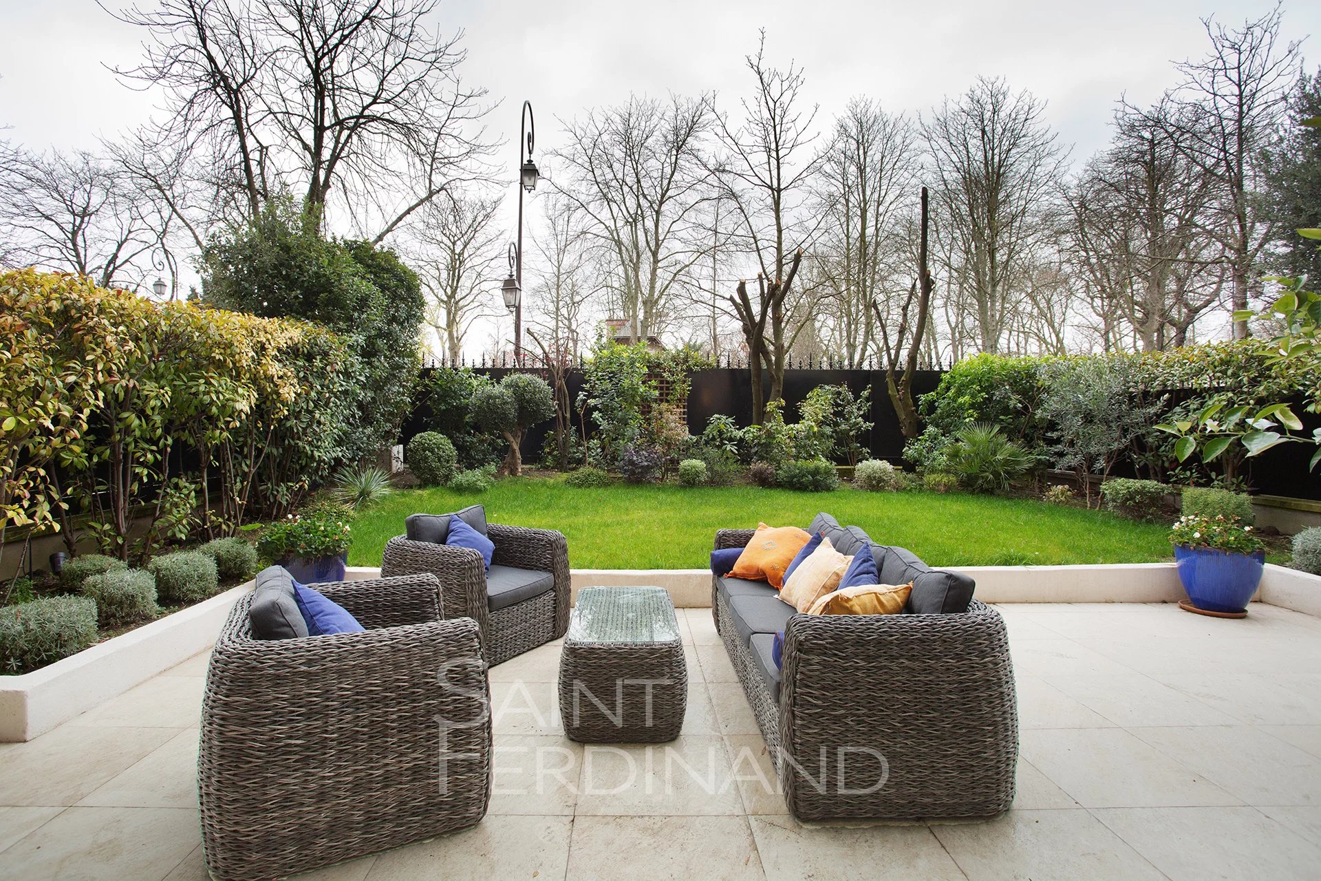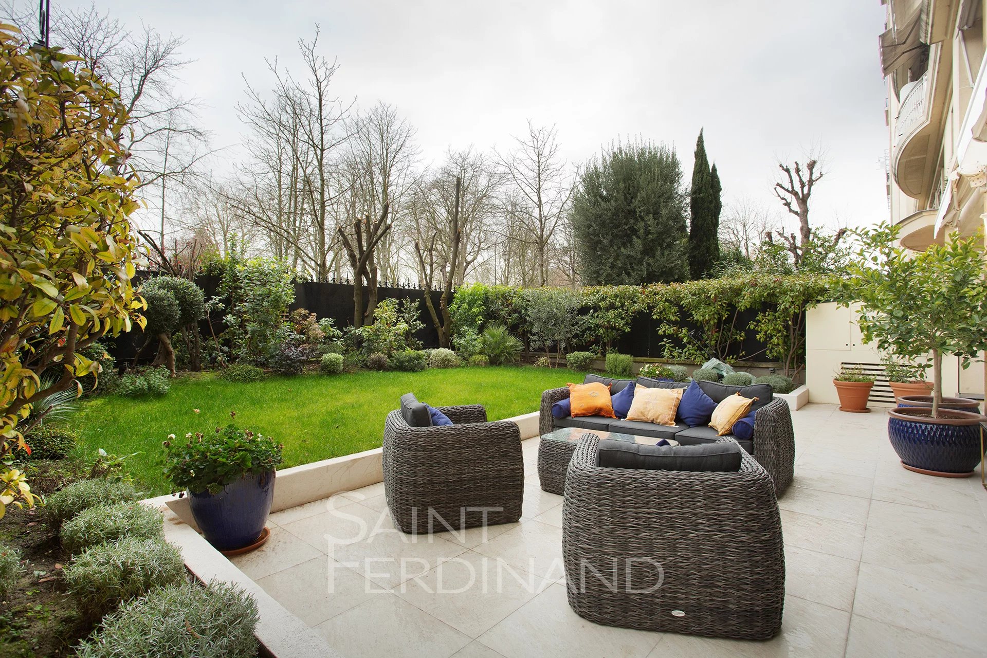 Limite Neuilly Bois Terrasse et jardin 16e Côté Neuilly sur Seine. Face au Bois de Boulogne, l’Agence Saint Ferdinand vous propose ce magnifique appartement d’une surface de 142m²(141,41m² Loi Carrez) aux prestations haut de gamme avec jardin et terrasse arborée, (130m²). Il se compose d’une entrée, d’une vaste réception baignée de lumière donnant sur la terrasse et le jardin, d’une cuisine semi-ouverte entièrement équipée, de 3 chambres dont une suite parentale avec dressing et salle de bains, une deuxième salle de douche.