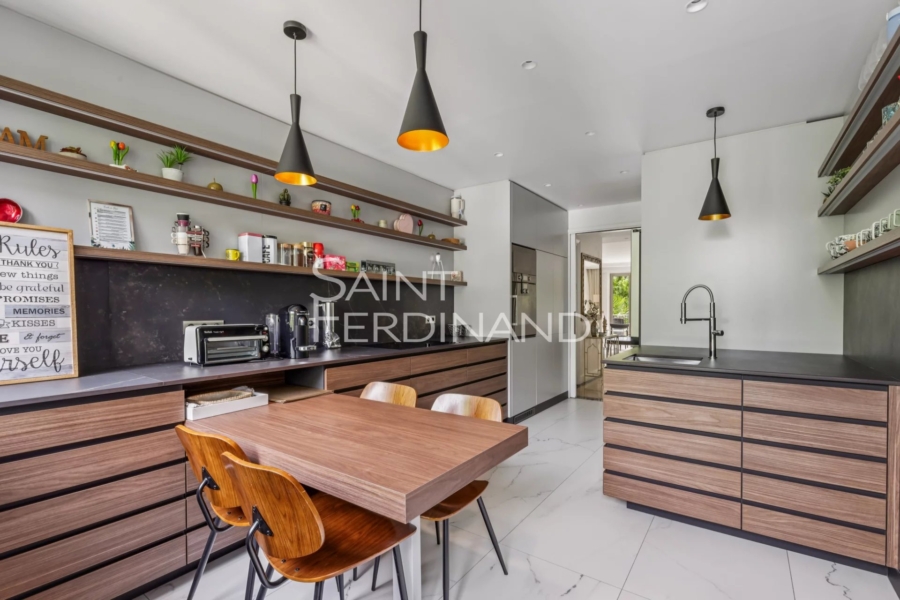 Neuilly 5 chambres Pasteur Le Groupe Sant Ferdinand Immobilier a le plaisir de vous présenter ce très bel appartement familial et de réception au 2e étage avec ascenseur dans une résidence de grand standing. Il se compose d’une entrée, une triple réception ensoleillée avec une belle salle à manger, une grande cuisine dinatoire attenante à une buanderie avec point d’eau, une suite parentale au calme sur jardin avec son dressing et sa salle de douche, séparée des 4 autres chambres et leur grandes et belles salles d’eau. Nombreux rangements, 4 WC. Un balcon de 20m2 borde l’appartement. Soleil, beaux volumes, très bon plan, parfait état. Climatisation. 2 caves et un box double complètent ce bien. Secteur lycée Pasteur.