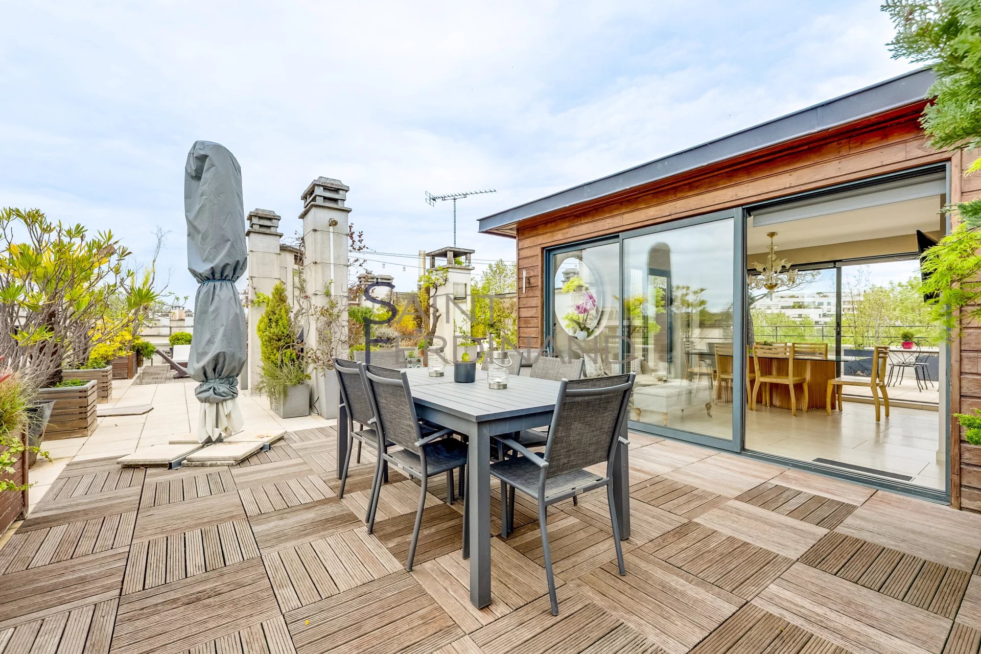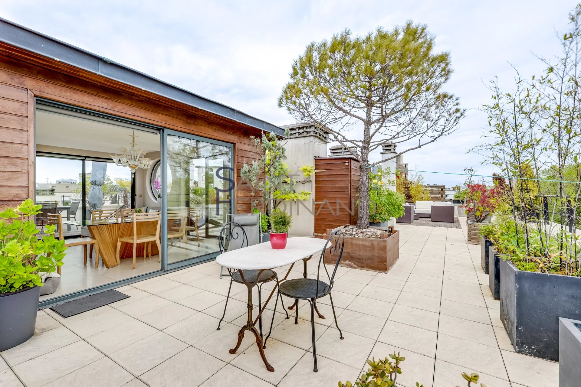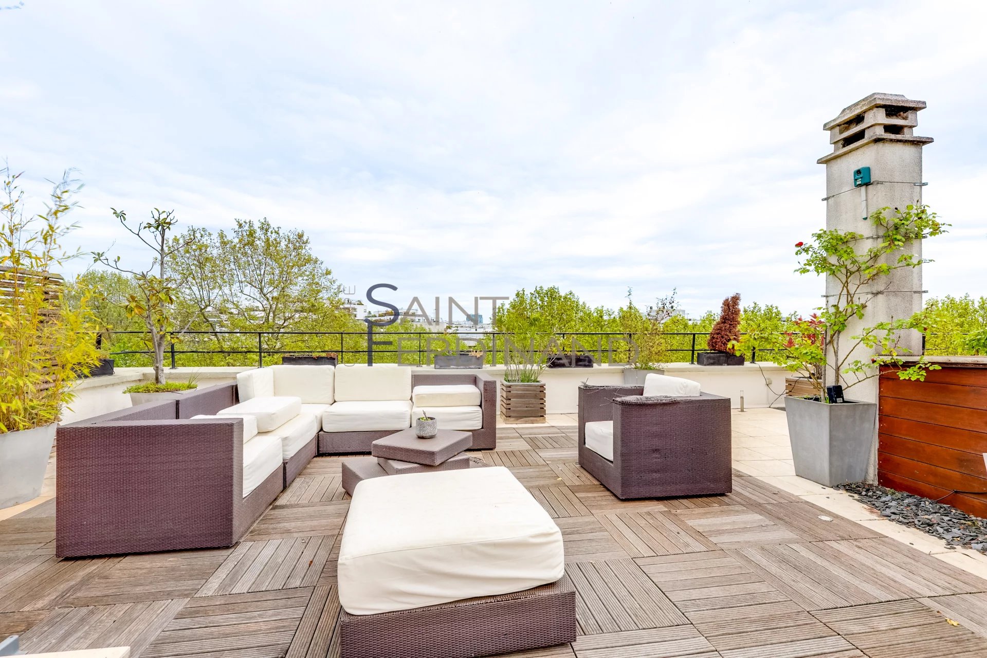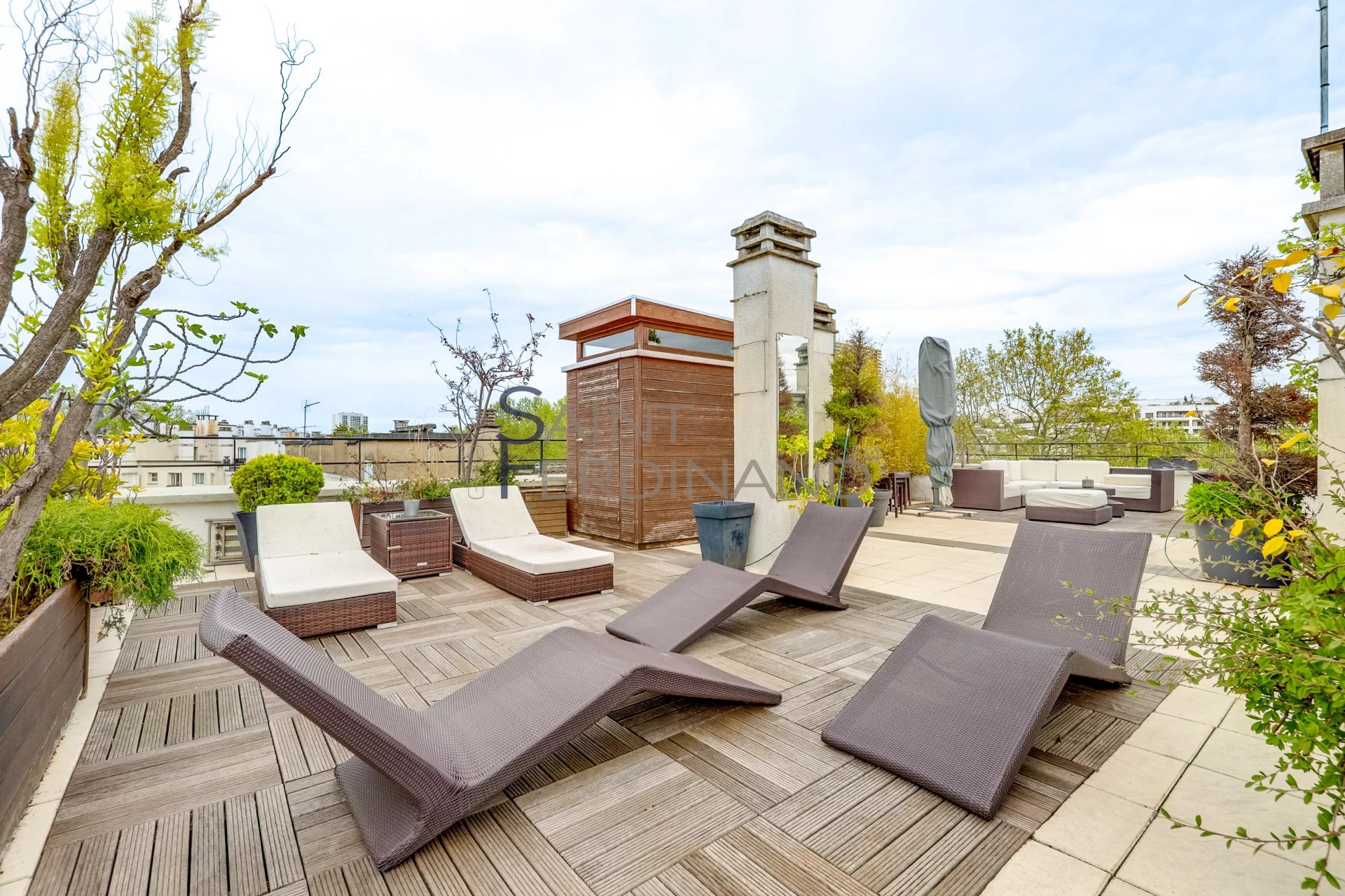 NEUILLY. DUPLEX TERRASSE. VICTOR HUGO. Neuilly sur Seine Bd Victor Hugo. Bel immeuble 1965 en pierre de taille. Le Groupe Saint Ferdinand vous propose un duplex rooftop au 5ème et 6ème étage (dernier) par ascenseur. Appartement cinq pièces de 128 m2 + une terrasse arborée et aménagée de 228 m². Il se compose au cinquième étage : un salon avec balcon filant, une suite parentale avec salle de bains WC et placards, deux chambres avec placards et leur salle d’eau. WC séparés. Au 6ème étage : une cuisine équipée ouverte sur la salle à manger donnant sur une superbe terrasse plein ciel. Buanderie. 2 caves et 2 parkings complètent ce bien d’exception. Climatisation. Parquet. Bon plan sans perte de place. Soleil. Calme. Commerces à proximité. Ecoles.