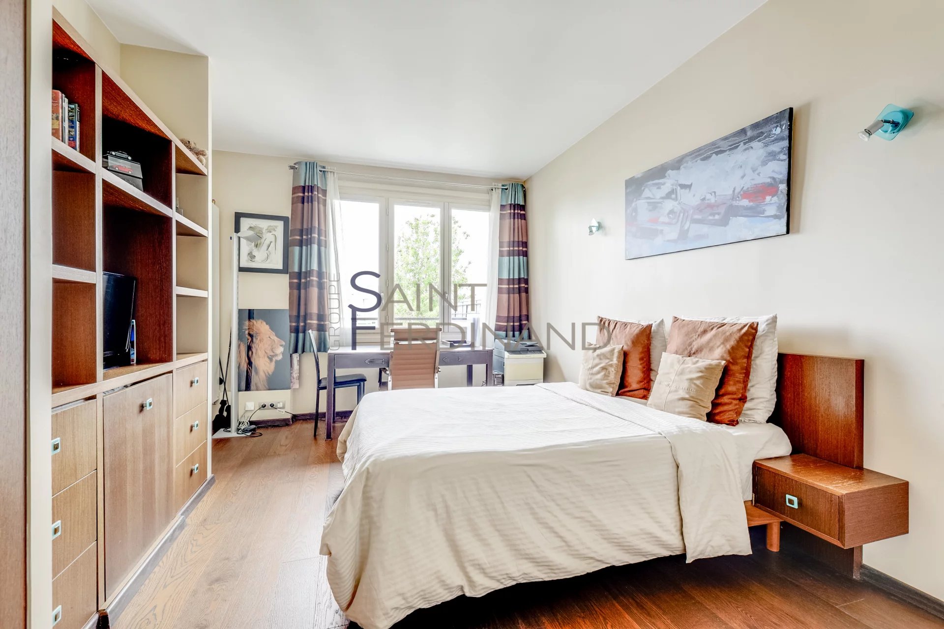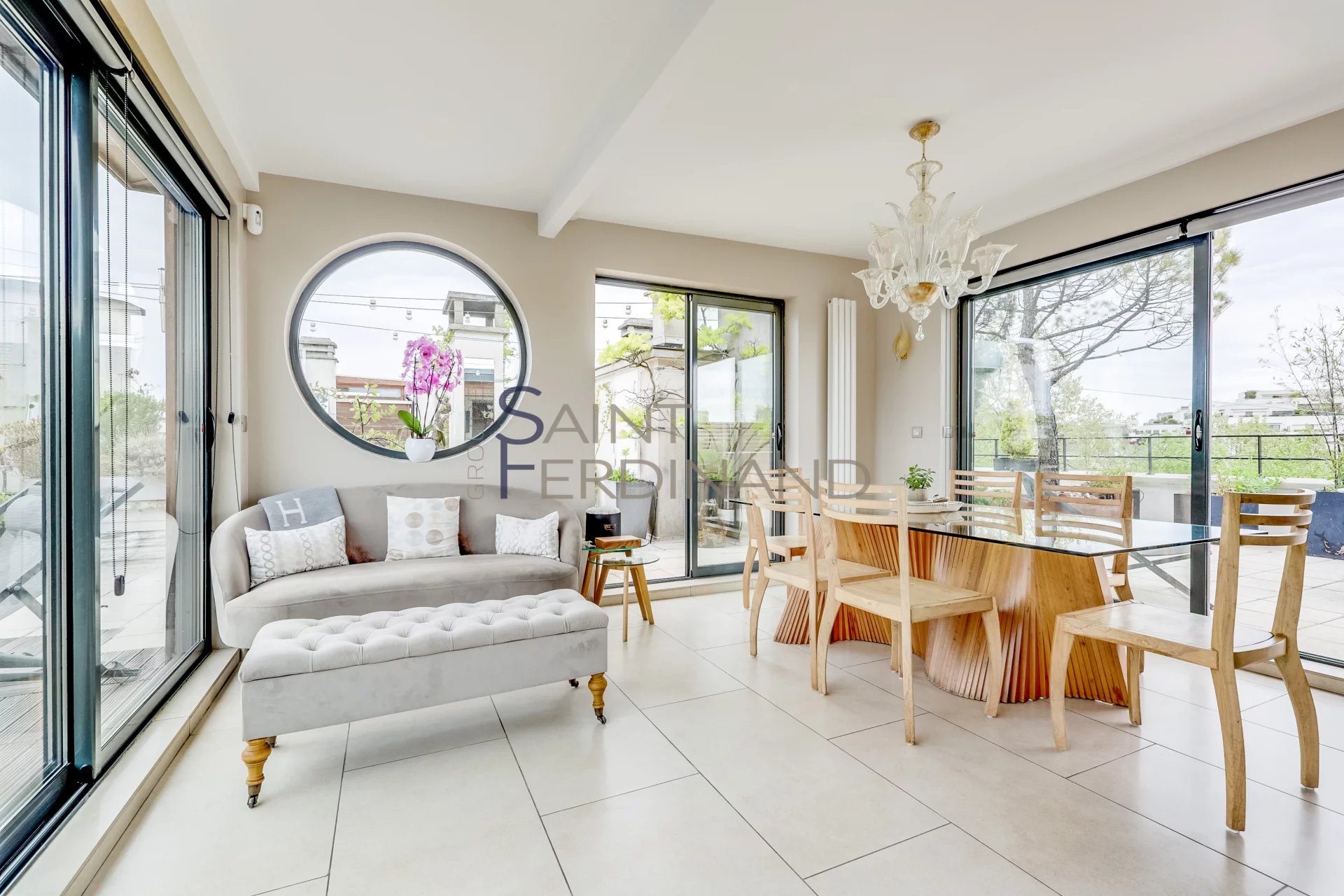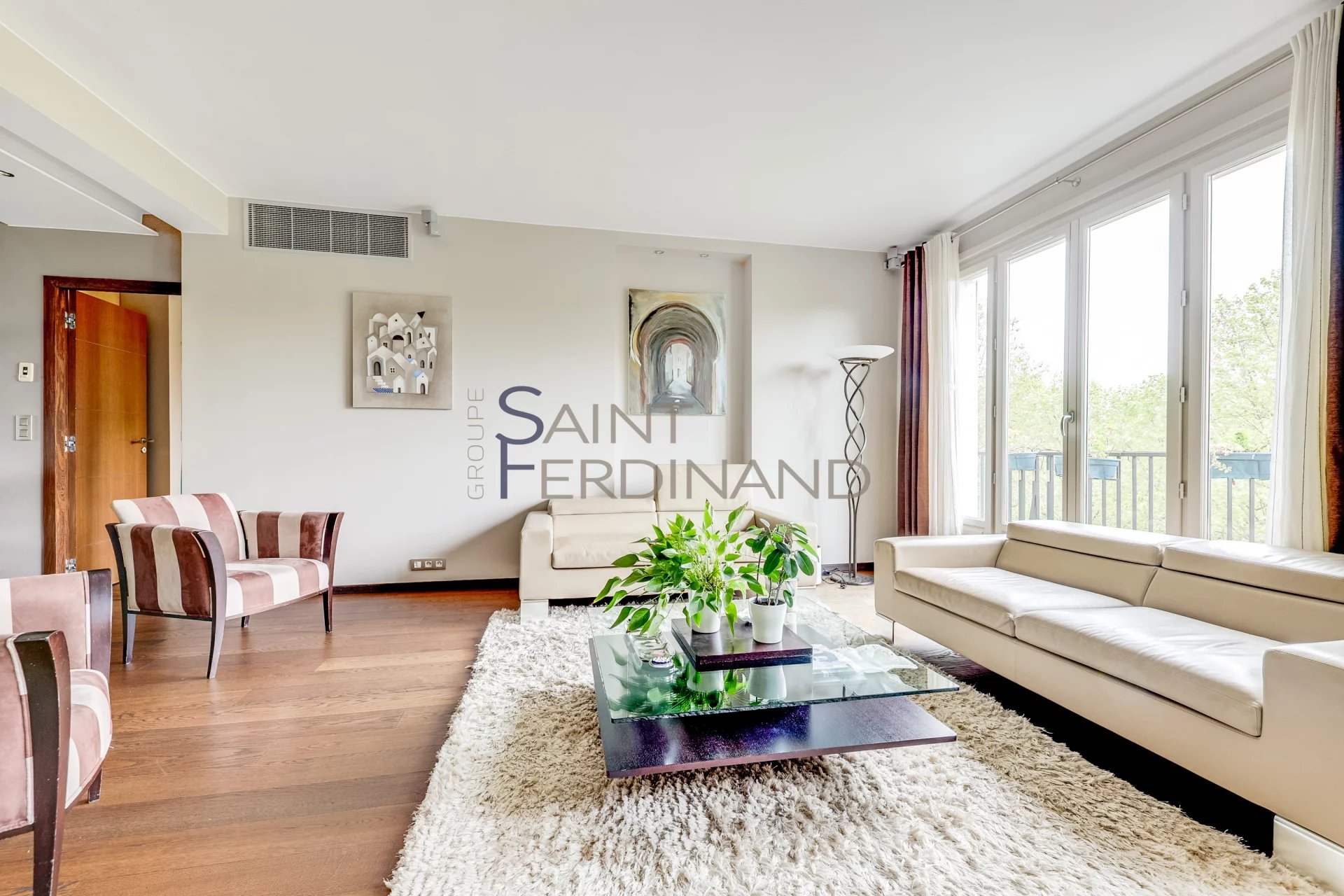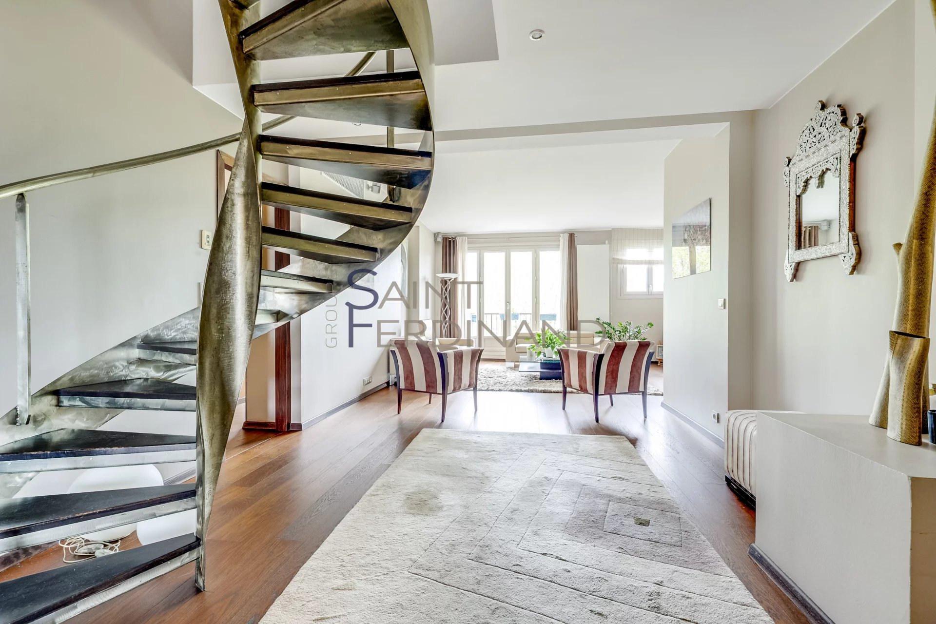 NEUILLY. DUPLEX TERRASSE. VICTOR HUGO. Neuilly sur Seine Bd Victor Hugo. Bel immeuble 1965 en pierre de taille. Le Groupe Saint Ferdinand vous propose un duplex rooftop au 5ème et 6ème étage (dernier) par ascenseur. Appartement cinq pièces de 128 m2 + une terrasse arborée et aménagée de 228 m². Il se compose au cinquième étage : un salon avec balcon filant, une suite parentale avec salle de bains WC et placards, deux chambres avec placards et leur salle d’eau. WC séparés. Au 6ème étage : une cuisine équipée ouverte sur la salle à manger donnant sur une superbe terrasse plein ciel. Buanderie. 2 caves et 2 parkings complètent ce bien d’exception. Climatisation. Parquet. Bon plan sans perte de place. Soleil. Calme. Commerces à proximité. Ecoles.