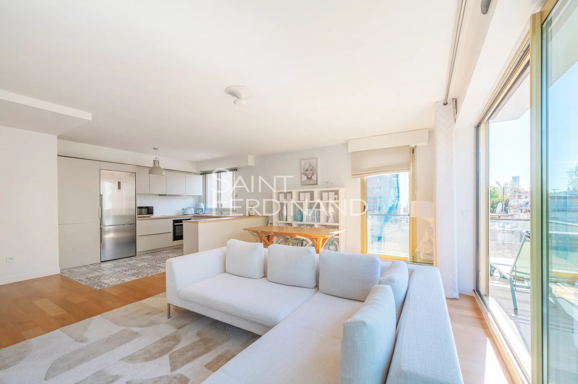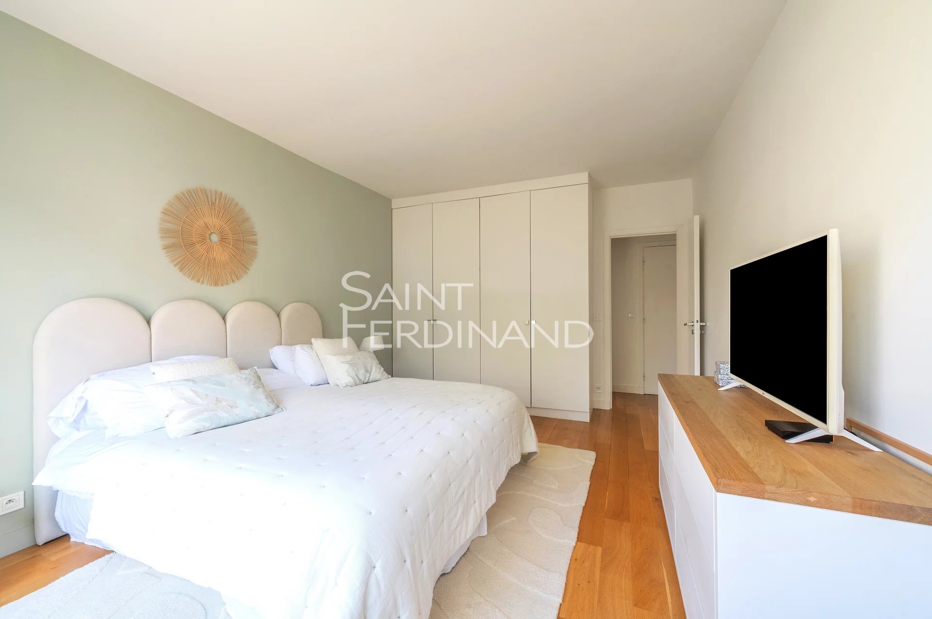 Neuilly Saussaye 2 chambres Large Balcon Saint Ferdinand Immobilier vous propose en exclusivité, au cœur d’un environnement verdoyant et prisé, situé au 3ème étage avec ascenseur d’un immeuble récent de standing, ce très bel appartement de 86 m² entièrement rénové et bordé d’un large balcon de 11 m2. L’entrée s’ouvre sur un vaste séjour d’angle ensoleillé et sa cuisine ouverte aménagée et équipée. L’espace nuit se compose de deux grandes chambres, chacune disposant de son dressing, une salle de bains avec WC et des toilettes séparées. Une cave ainsi qu’un emplacement de parking dans l’immeuble complètent ce bien.
