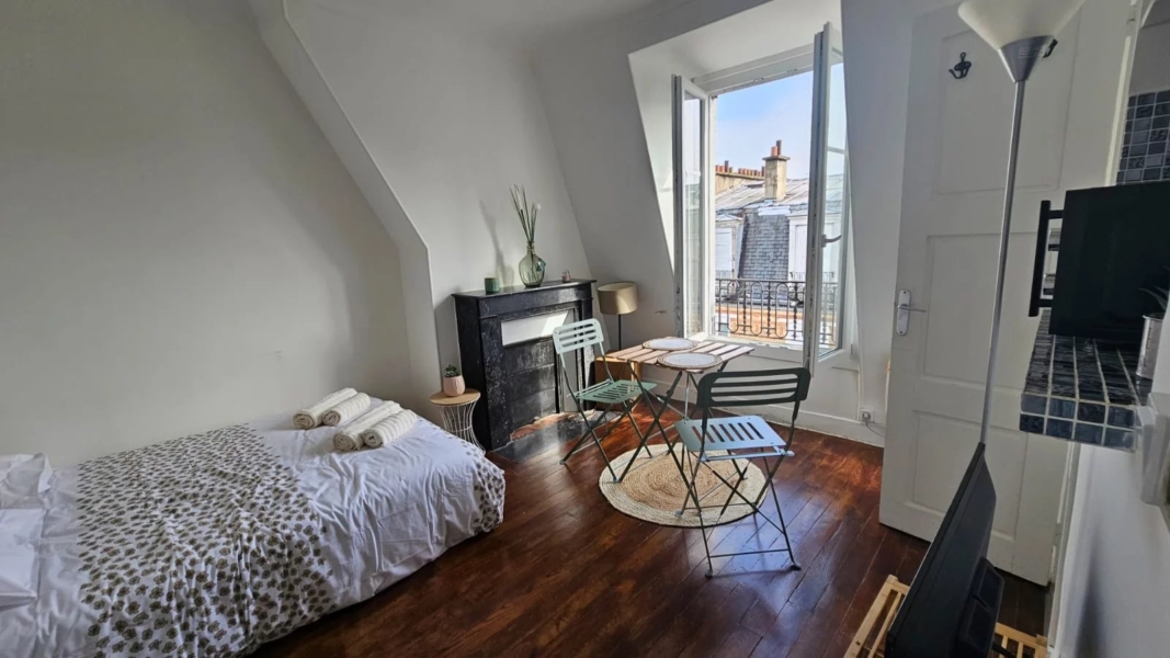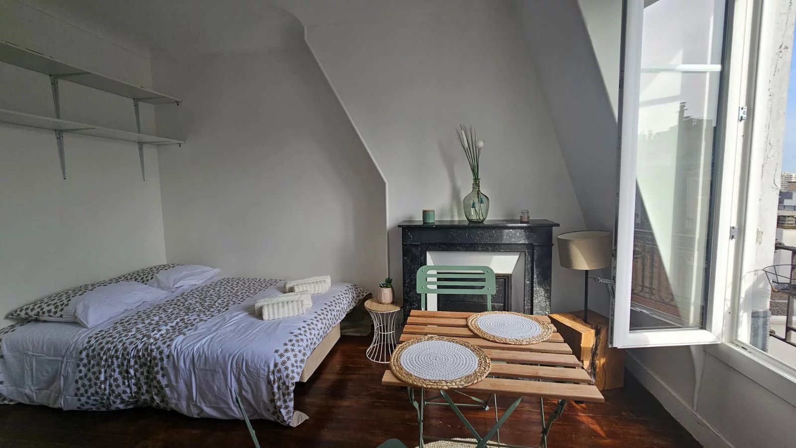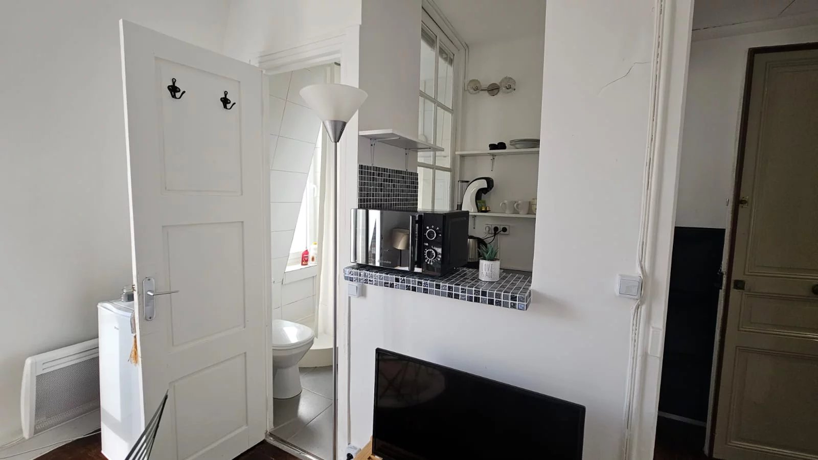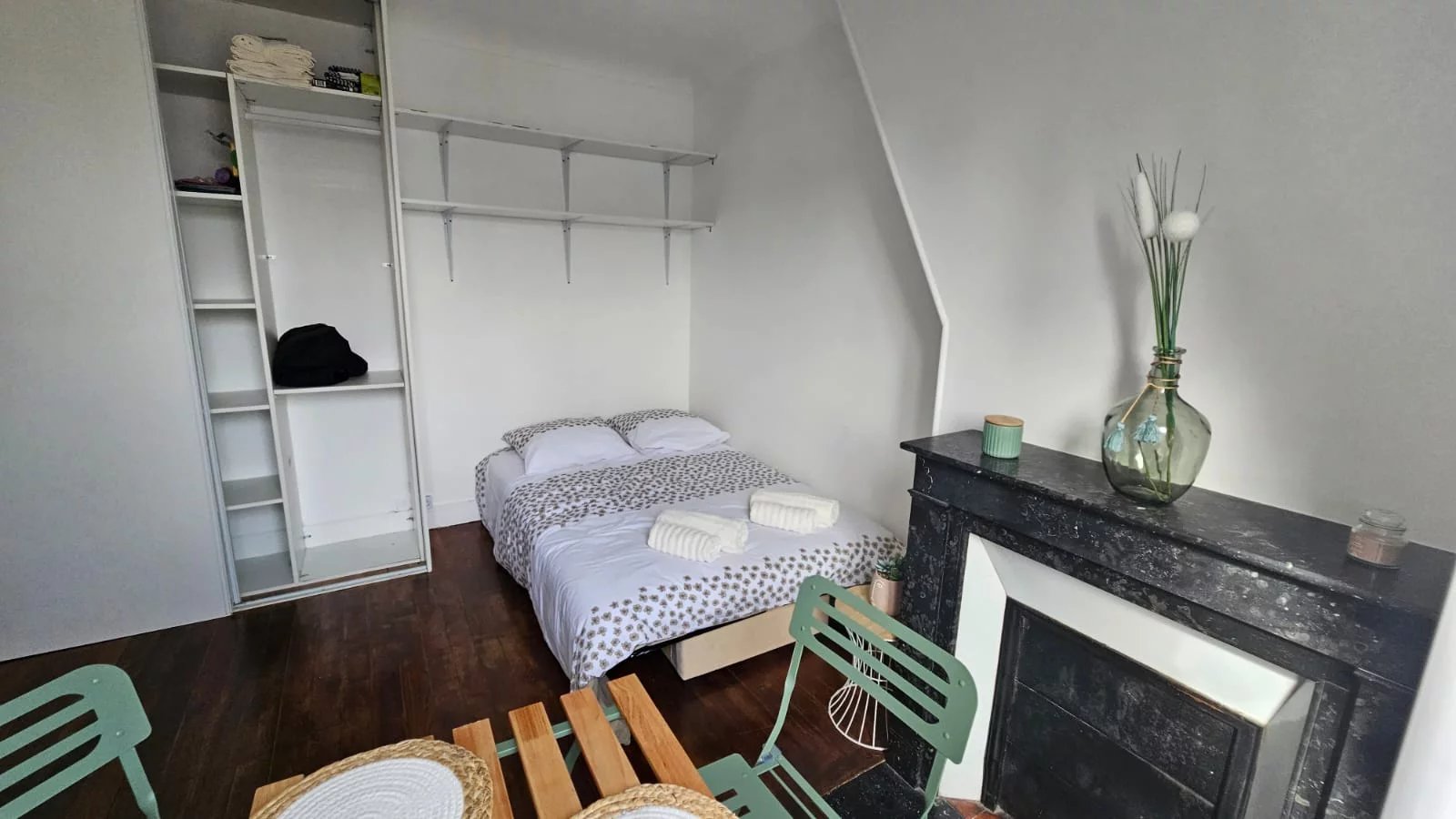 Neuilly Sur Seine / Château Magnifique studio de 16 m2 au 7ème et dernier état avec ascenseur, se composant d’une belle pièce à vivre avec cheminée et parquet en chaine massif, cuisine semi ouverte équipée, salle d’eau avec vrai WC. Placards rangements. Charme assuré.