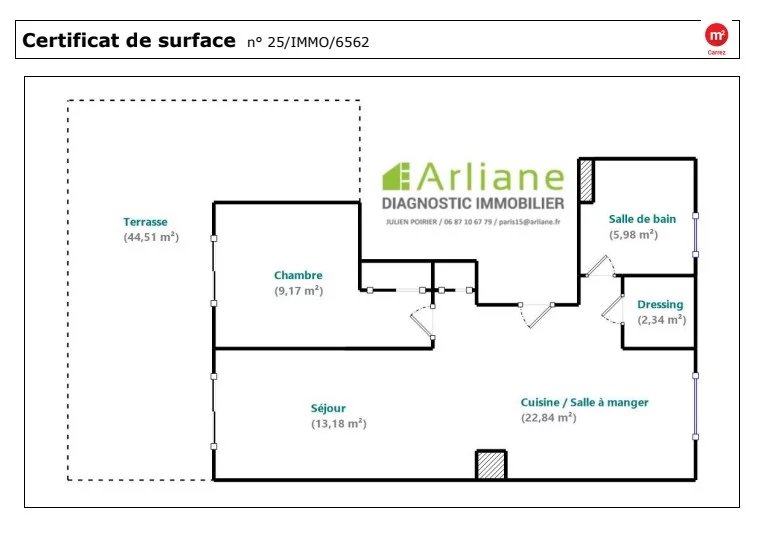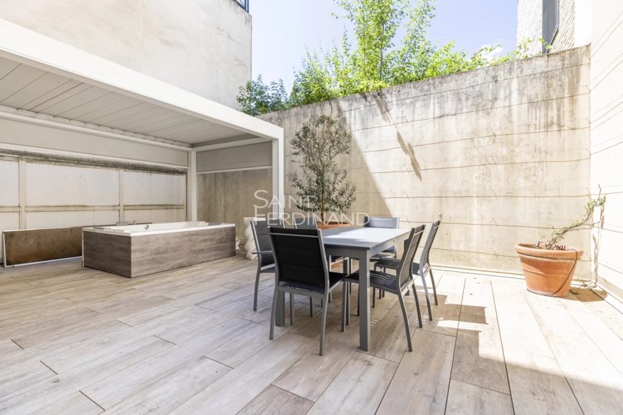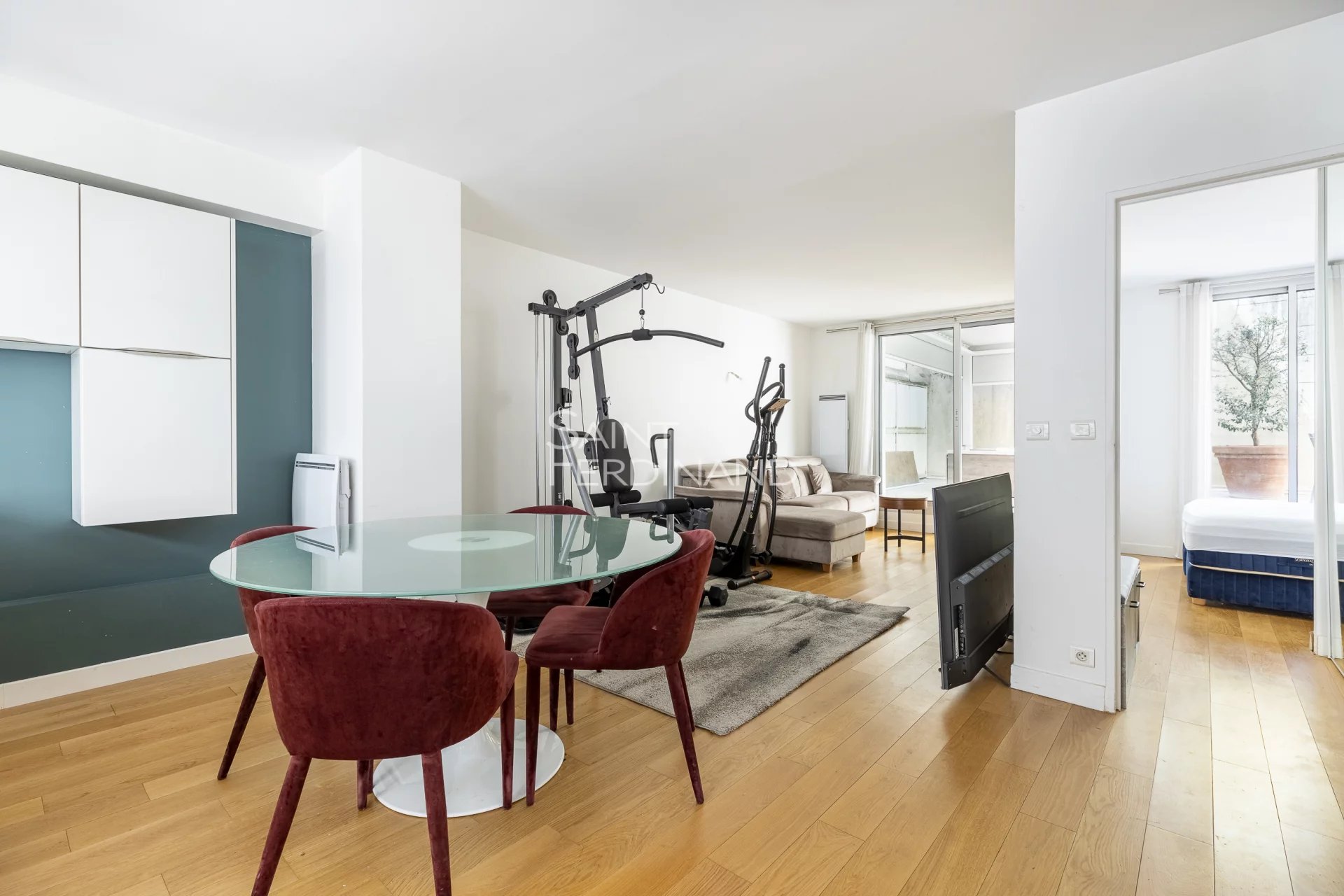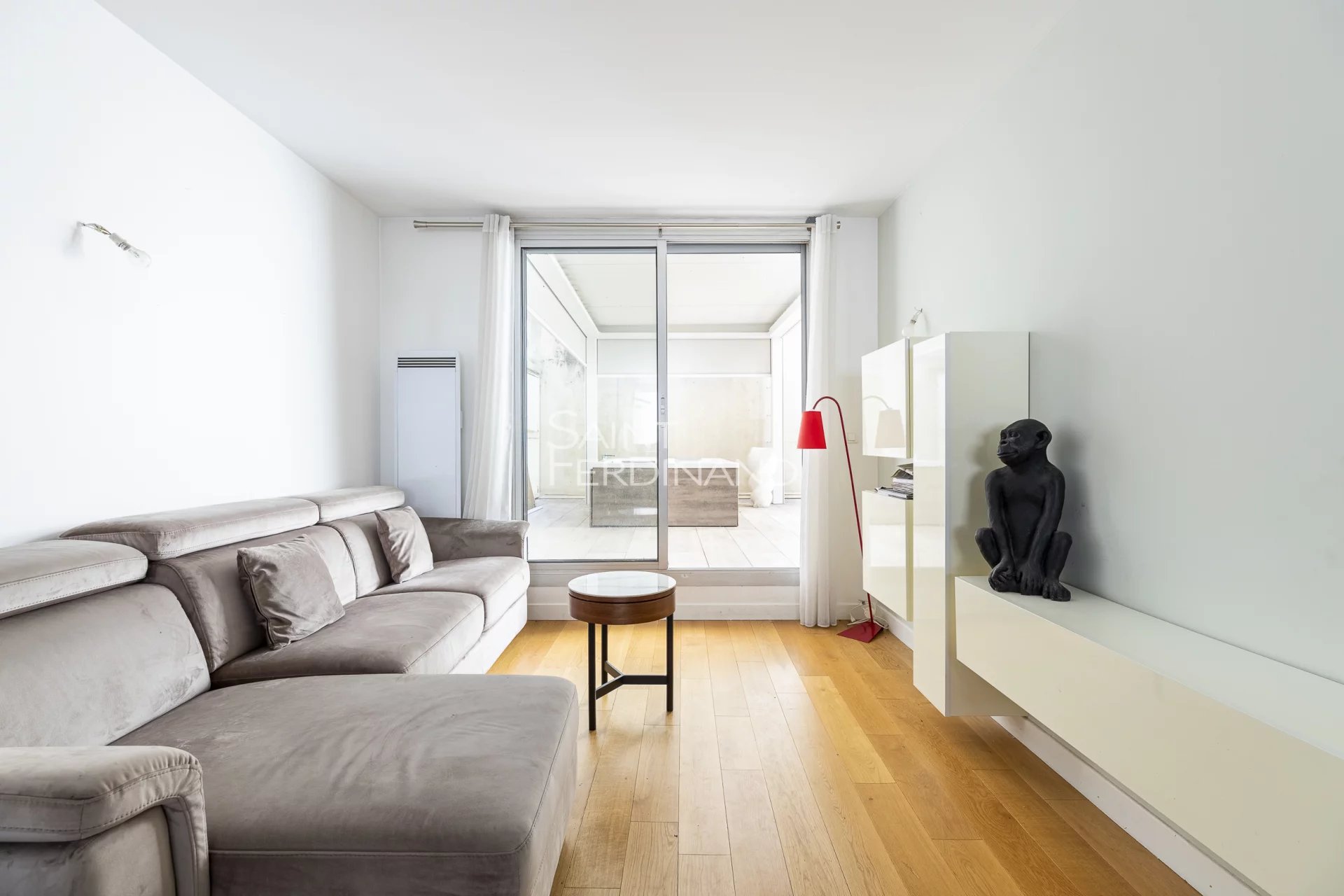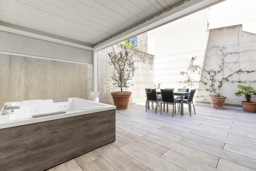 PARIS 15. CH.MICHELS/JAVEL. 1er ét. 3 p. 53,51 m² + terrasse/jaccuzzi 44 m². Bien rare Dans une petite résidence récente de 1987, le groupe Saint Ferdinand vous propose un appartement traversant baigné de soleil de 53,51 m² Carrez (surface pondérée de 68,34 m²) au 1er étage avec ascenseur composé de : une entrée, un vaste séjour donnant sur une terrasse de 44,51 m² offrant un jaccuzzi extérieur avec une pergola (possibilité de l’ouvrir ou de la fermer entièrement), une cuisine ouverte équipée, une chambre, un dressing, une salle de bain avec baignoire balnéo et toilettes.