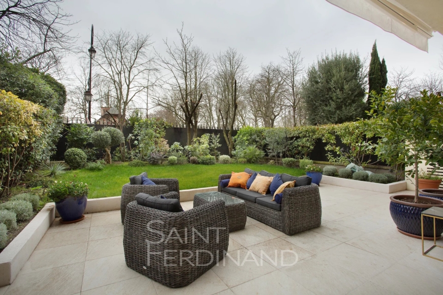 Paris 16ème limite Neuilly Bois Terrasse et jardin A Paris 16ème Côté Neuilly sur Seine. Face au Bois de Boulogne, l’Agence Saint Ferdinand vous propose ce magnifique appartement d’une surface de 142m²(141,41m² Loi Carrez) aux prestations haut de gamme avec jardin et terrasse arborée, (130m²). Il se compose d’une entrée, d’une vaste réception baignée de lumière donnant sur la terrasse et le jardin, d’une cuisine semi-ouverte entièrement équipée, de 3 chambres dont une suite parentale avec dressing et salle de bains, une deuxième salle de douche.