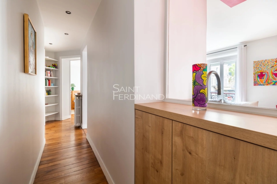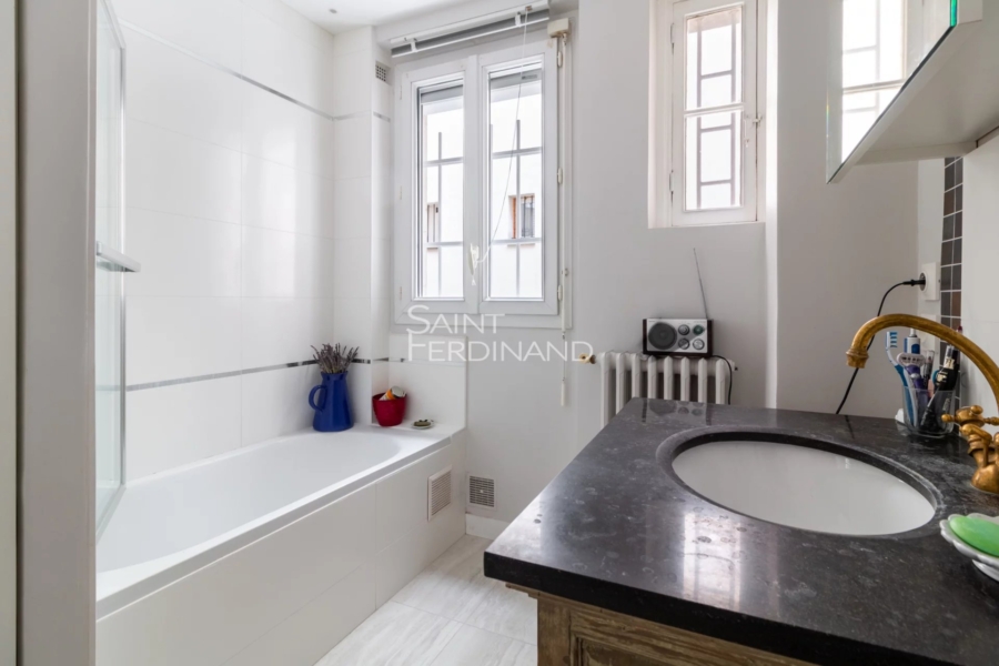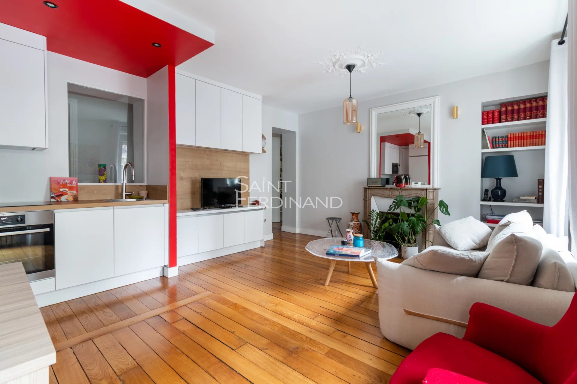 Paris 17eme Marché Lévis 1 chambre très lumineux Villiers. Dans un bel immeuble Pierre de taille, Saint Ferdinand Immobilier vous propose un superbe appartement entièrement refait par architecte. Il se compose de: entrée, double séjour avec cuisine ouverte équipée, chambre avec dressing, salle de bain, Wc séparé et cave. Lumineux (exposition Sud- ouest) avec vue dégagée. Charme de l’ancien: parquet, moulures, cheminées et belle hauteur sous plafond. Charges mensuelles: 173euros.