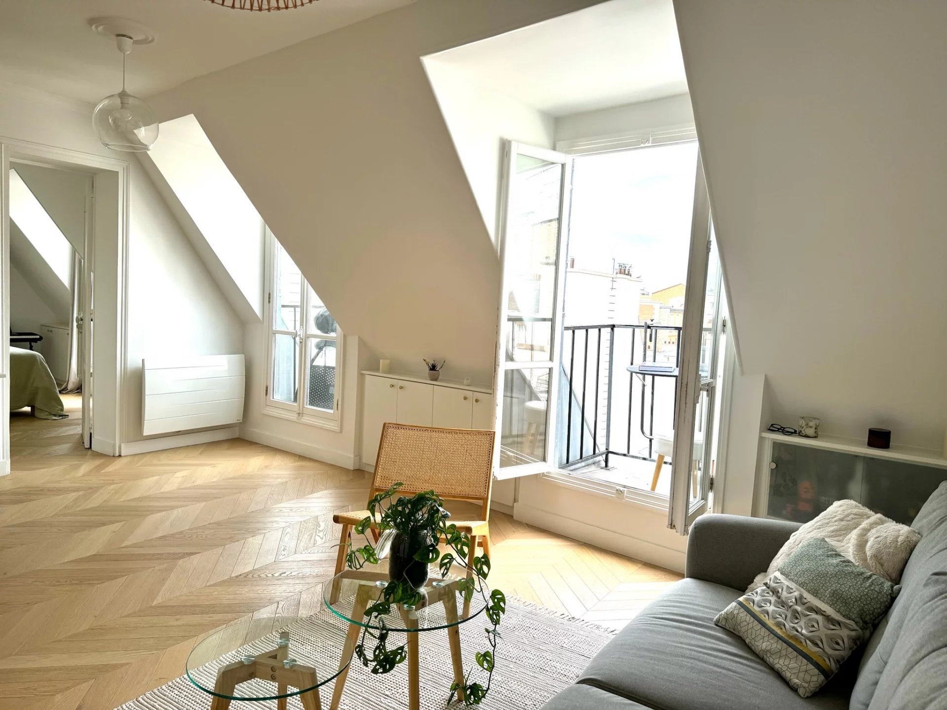 Paris 8ème – Miromesnil – 2 pièces rénové – balcons et vue tour Eiffel Au cœur du prestigieux 8ᵉ arrondissement, cet appartement de 52 m² au sol (44 m² Carrez) est au 6ème et dernier étage d’un immeuble en pierre de taille de standing. Lumineux, au calme et sans vis-à-vis, il se compose d’un vaste séjour avec cuisine ouverte équipée donnant sur des balcons avec vue dégagée exposé Sud Est, une grande chambre avec rangement sur mesure, une salle de douche avec toilette. une cave. Vue dégagée sur la Tour Eiffel.