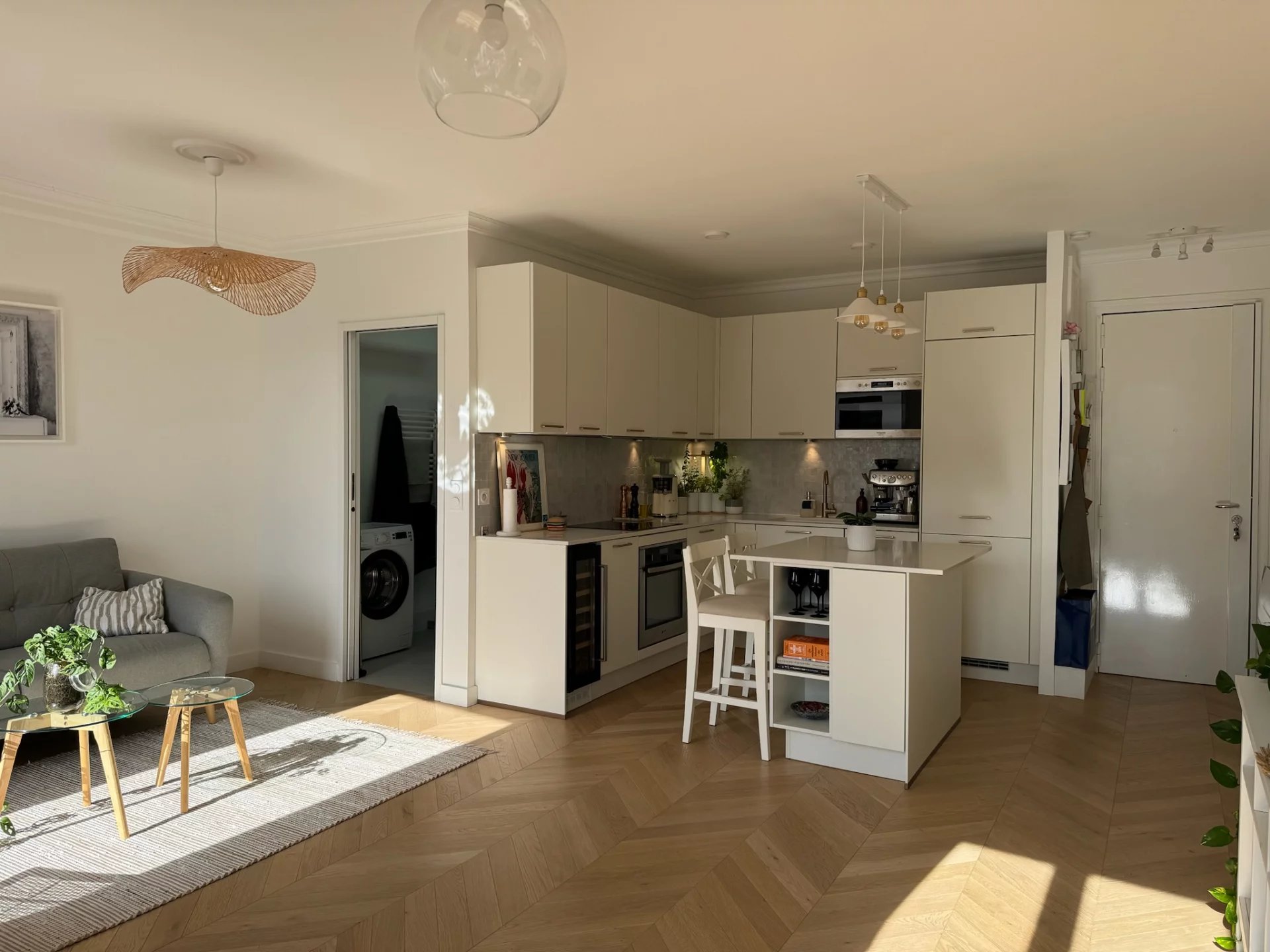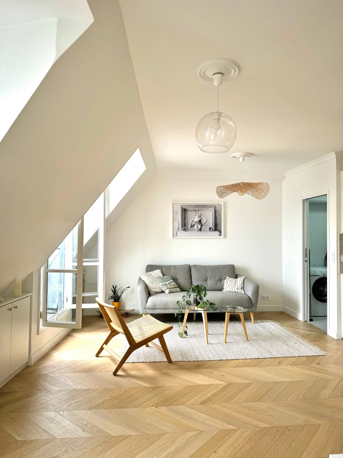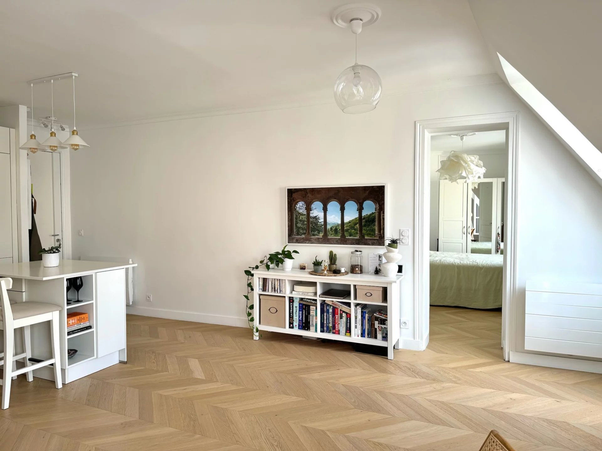 Rénovation haut de gamme et de qualité : parquet en point de Hongrie, cuisine en quartz, dressing sur mesure, combles optimisés, salle de bain avec fenêtre zénithale,