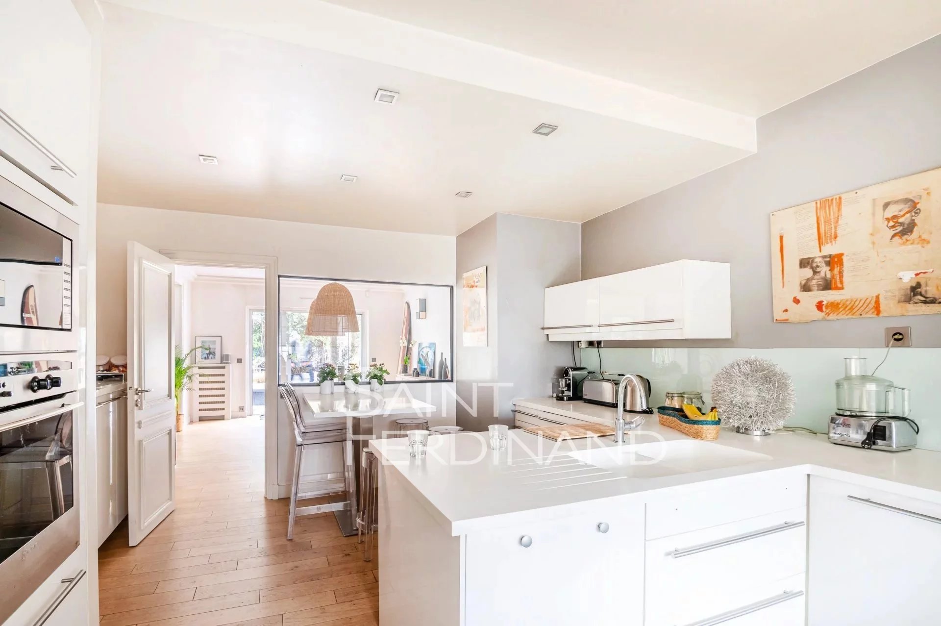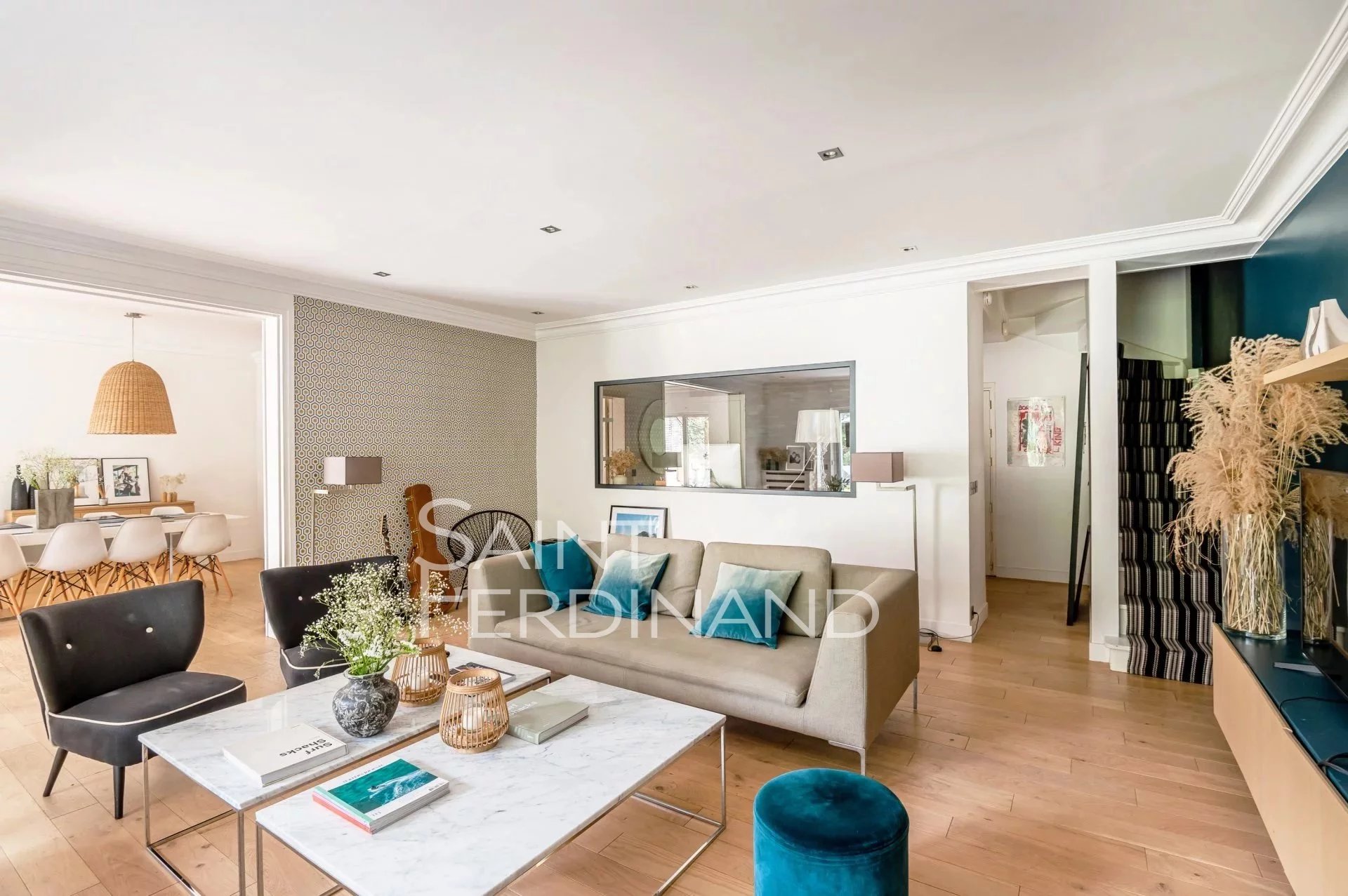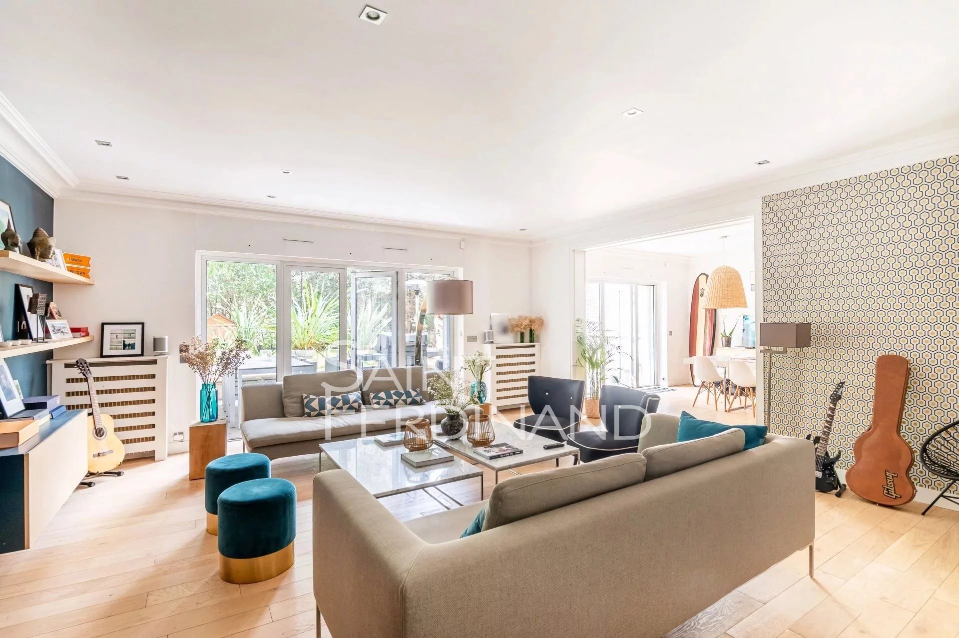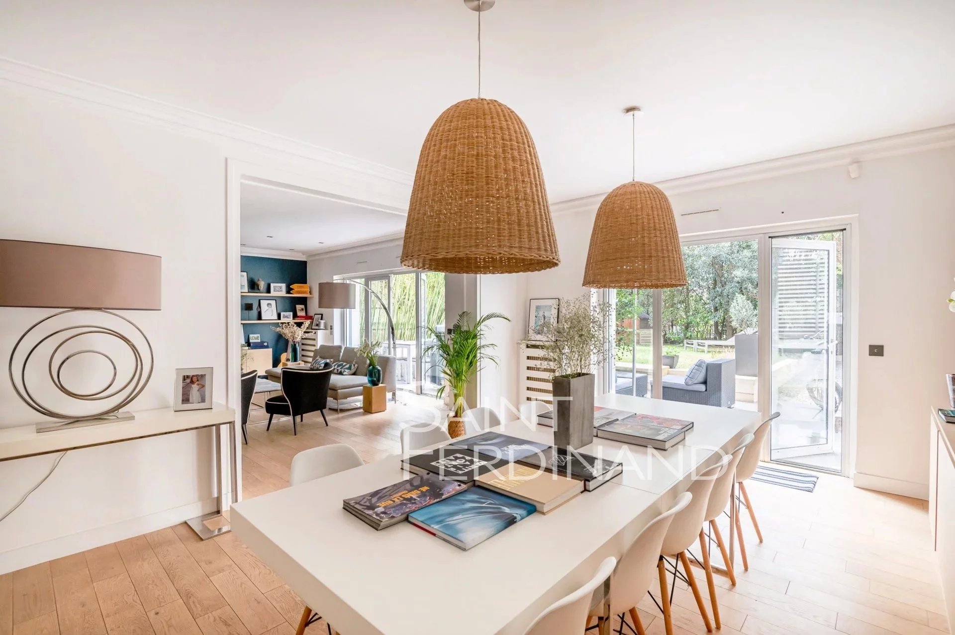 Rez de Jardin 3 chambres Duplex Saint Ferdinand Immobilier vous propose ce superbe duplex traversant de 174m² avec terrasse et jardin de 200m² exposés sud-ouest. Il se compose au rez de chaussée d’un large et très beau double séjour tout en baies vitrées donnant sur le jardin, une cuisine ouverte sur le séjour entièrement équipée avec espace dinatoire, un bureau, une buanderie, un dressing ainsi qu’un WC d’invité.
